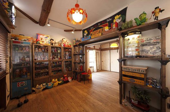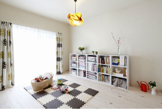 外部造型似向日葵的吊燈,樣式別致,散發(fā)的燈光柔和不會讓人覺得耀眼。深棕色的百葉窗與木質(zhì)地板和儲物柜一起營造出夢幻般的溫馨世界。門兩側(cè)的多層開放式儲格,為體積不同的模型分別找到了安放之處。而開放式的形式,也增加了空間的利用度。頂層擺放多個玩偶模型,既讓孩子覺得生動有趣,又會降低木質(zhì)材料帶給孩子的壓迫感。