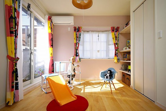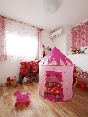 粉色的墻壁打造出柔和輕松的基調(diào)。紅黃色相間的卡通窗簾,很符合孩子們的口味,也讓空間的顏色變得不再單一。因為房間面積有限,角落用隔板改造成開放式的儲物區(qū)域,既不會顯得空間沉悶,也避免了玩具過多帶來的凌亂。房間中央擺放了孩子喜歡的小滑梯,可愛的玩偶,色彩鮮明,童趣十足。