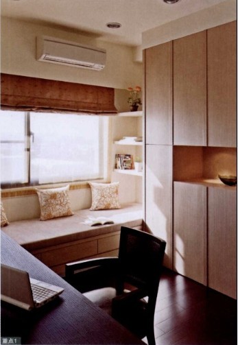 書房除了書柜外,沿窗還規(guī)劃了休憩觀景座,類似于飄窗的做法,不過這里不是外露的陽臺。它不僅作為座椅使用,其下方還規(guī)劃了收納柜,可以用來存放季節(jié)更換的中型物件,如棉被,存衣等等。