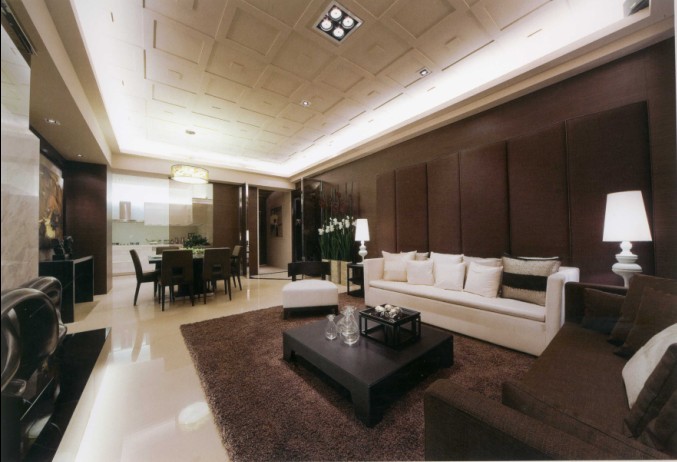 沉穩(wěn)低調(diào)的巧克力色調(diào)背后景墻,同色系的地毯,配以簡(jiǎn)約款的白色沙發(fā)相間其中,描繪出了客廳的樣貌??蛷d與餐廳地面都用玻面磚,與墻面的深色系相應(yīng),增加空間的穿透感。
