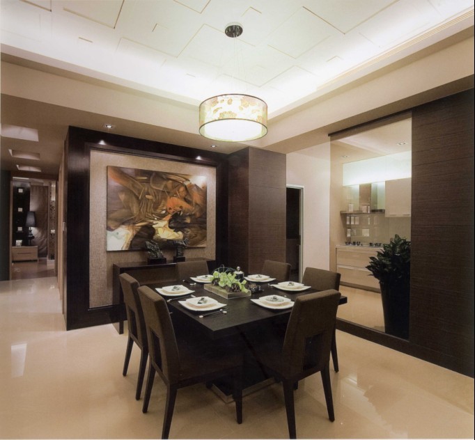 本案雖然為現(xiàn)代風(fēng)格,在餐廳里卻有了中式的感覺(jué)。客廳與餐廳沒(méi)有隔開,只是在地面上做了簡(jiǎn)單的區(qū)隔,方便衛(wèi)生打掃,餐廳與廚房都采用地磚,客廳則選擇了整塊地毯來(lái)裝飾。素雅的餐廳,一幅抽象畫裝飾其中。