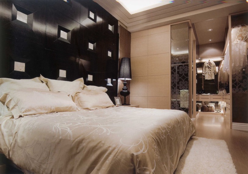 臥室是收納的重要地方,利用貝殼板及黑檀直紋木皮裝飾出一面具安定效果的床頭背景墻。一個(gè)個(gè)格子既是裝飾品又是收藏空間,實(shí)用之極!將另一個(gè)小房間規(guī)劃成衣帽間,放大了臥室的空間。完美了整體效果。