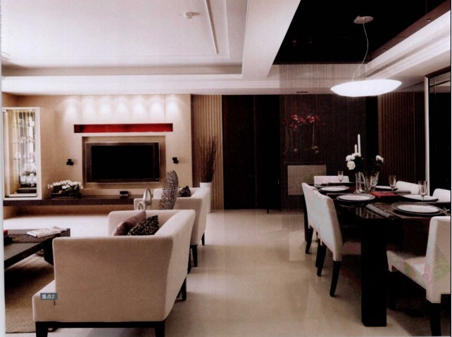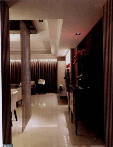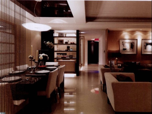 用溫馨的米**沙發(fā)跟墻面相同統(tǒng)一,深咖啡色的木質(zhì)家具與溫馨的米色搭配。讓客廳與餐廳都有一個溫馨舒適的居家氛圍。業(yè)主是個很有生活情趣的人,喜愛收藏。所以設計師從玄關開始就規(guī)劃了展示空間,隱藏式電視墻搭配局部展示柜,通過燈光及鏡面來突顯出收藏品的質(zhì)感。