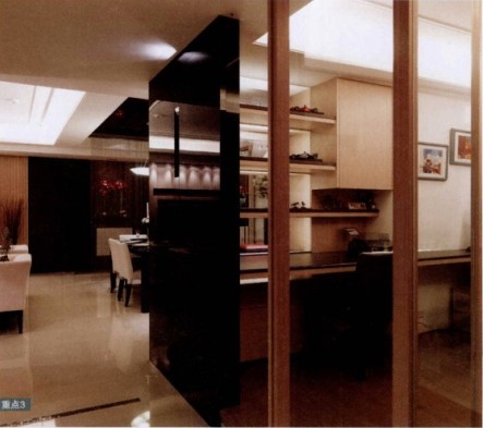 在位于走道旁的書房,為了讓空間更通透,設計師采用具有反射作用的烤漆玻璃,以及有加大空間效果的玻璃門,營造出開放式的寬敞感。以層板高低排列的展示書架,又成為書房與餐廳的隔斷。