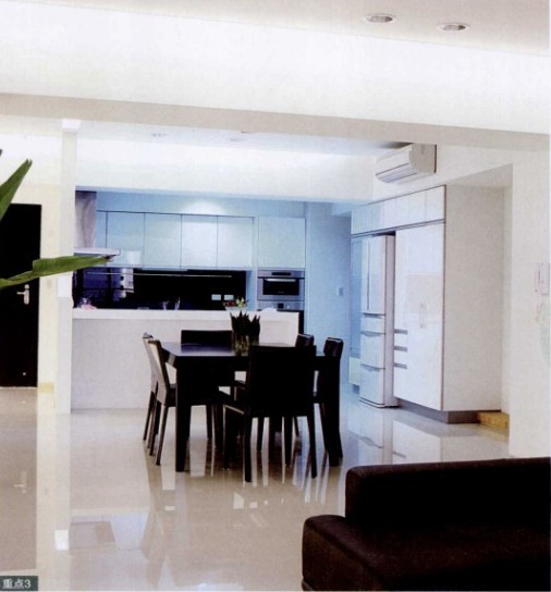 廚房與餐廳的設(shè)計(jì)是以功能為主的,除了結(jié)合冰箱的隱藏式收納柜,吧臺(tái)也是收納空間之一哦,特意選擇黑色玻璃烤漆對(duì)應(yīng)白色柜體,展現(xiàn)出時(shí)尚的動(dòng)感。淺色與黑色相互融合的餐廚空間,冷暖色調(diào)沖擊,有著淡淡的冷意,溫馨感不夠。這是本案用色上存在的問題。