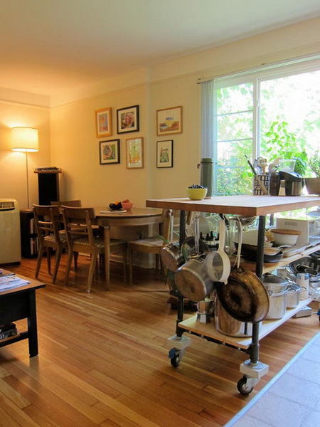 可活動(dòng)的收納架上擺放著鍋碗瓢盆,將不同種類,不同大小的鍋碗瓢盆分門別類放置在收納架上。不用的時(shí)候可以將它移到貼墻處,讓空間保持開闊。