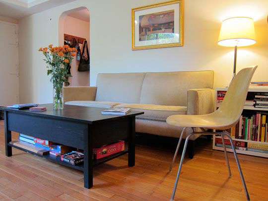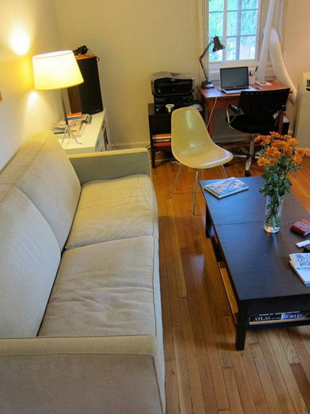 在黃色臺(tái)燈的照耀下,家里的燈光顯得柔和溫暖。從上方看上去,茶幾里面的書籍是收得嚴(yán)嚴(yán)實(shí)實(shí)的,看不出有什么破綻。書桌隔壁放著的收納柜,不僅放了書籍,也放了打印機(jī),讓書桌的空間較大的同時(shí)也活用了收納柜頂部的空間。