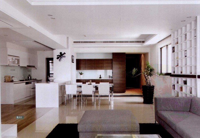 前面提到業(yè)主喜愛(ài)音樂(lè)并喜歡收藏碟片,他有大量的CD、DVD片,需要一個(gè)專(zhuān)屬空間來(lái)存放它們。設(shè)計(jì)師便在客廳與餐廳中段的過(guò)渡空間規(guī)劃了整齊的格子柜主墻,并綿延至沙發(fā)區(qū),而中段的深色木條在白色柜中間對(duì)比更顯強(qiáng)烈,展現(xiàn)出水平、垂直線條的美感。