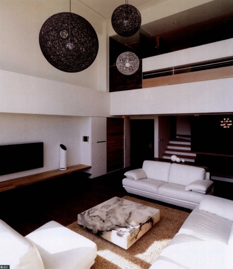 設(shè)計(jì)師分別選擇栓木貼皮與特殊樹脂裝飾兩個(gè)挑高空間的主墻,營造自然而時(shí)尚的迷人氛圍。同時(shí)沿落地窗規(guī)劃了L形收納矮柜,并延伸至電視墻,既可作觀景臺(tái),又可收納視聽音響設(shè)備。