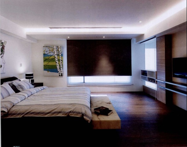 主臥規(guī)劃在樓上,包含了更衣室及專用浴室。為維持一貫的簡潔,設(shè)計(jì)師特別設(shè)計(jì)了造型電視墻并連接展示層板。為了保證睡眠空間良好的睡眠氛圍,窗簾飾品采用深色系,可以很好的阻隔室外光線。