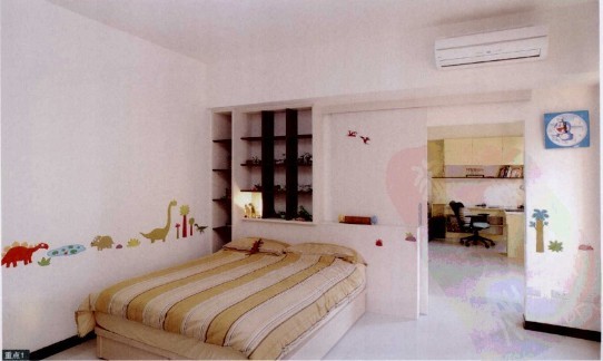 小兒子喜歡收藏恐龍玩具,并時常拿出來把玩,于是設(shè)計師特別規(guī)劃了以恐龍為主題的臥房,恐龍造型墻貼為空間注入歡兇的元素。床頭的展示柜成為恐龍玩具的家。