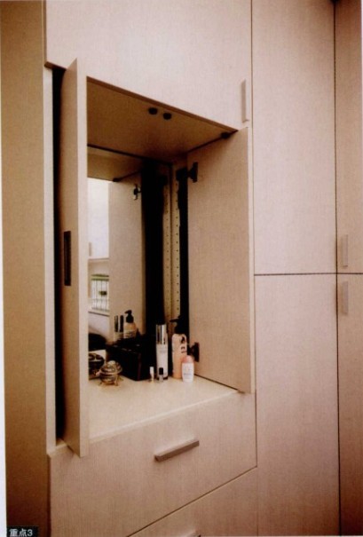 受限于空間大小,主臥沒有另外隔出更衣室,而女主人希望所有雜物都能夠收得干干凈凈。設(shè)計師在床頭板及左側(cè)墻面規(guī)劃了衣物收納柜,化妝臺也以所推拉式隱藏其中。