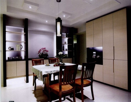 餐廳規(guī)劃了落地收納柜及展餐柜,并配合隱藏式燈,讓空間更為明亮,并減少壓迫感。因為設(shè)有隱藏的展示柜后面的燈具,餐廳里只用一盞簡單的燈具,與利落的空間相呼應(yīng)。