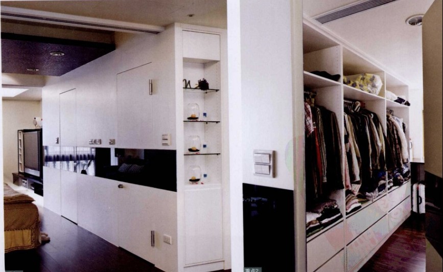 茶色鏡面門片的衣柜,不僅可以讓空間擴大,還可以將無法避開的結(jié)構(gòu)柱隱藏其中,利用隱藏式門片設(shè)計,將收納功能充足的更衣室隱藏其中,空間既具整體感,也有美化的效果,適度使用整體家具,再搭配木作嵌入黑鏡的門片收邊,可以有效降低裝修預(yù)算。
