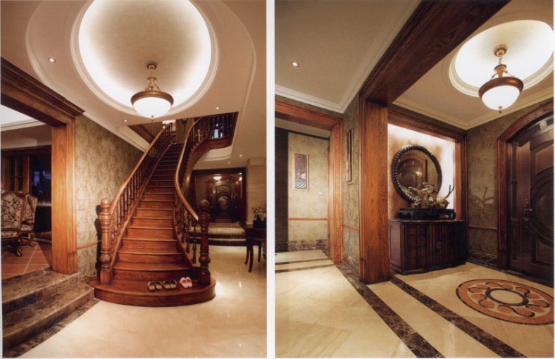 本案是帶有南、北兩個室外花園的獨棟別墅,是專為成功且品位高雅的人士量向定制的。此案的空間定為美式風(fēng)格。便捷、隨意、休閑是美式家居的特色,因此,在整個環(huán)境的設(shè)計中,應(yīng)該避免刻意的裝飾,并強調(diào)合理的交通流線,以保證不同功能布置的實用與方便。為了豐富空間的層次和展現(xiàn)空間的文化積淀,設(shè)計師在材質(zhì)上選用的都是仿舊、仿古系列。