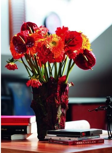 即使環(huán)境的溫度沒有發(fā)生變化,正確的顏色搭配也可使人心理“調(diào)溫”,花藝作品通過花卉自身濃重的深紅、橘紅、橘黃等暖色,將溫度提升。選用與花材同色系的花器,將變?nèi)~木的葉子貼在花瓶表面,形成“葉子做成的花器”,使整體的自然氣息更加濃厚。