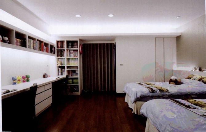 概要: 本案中的業(yè)主有兩個正在讀小學(xué)的孩子,業(yè)主在家居設(shè)計時,除了風(fēng)格的營造外,功能相對重要。設(shè)計師讓色彩單純化,把設(shè)計重點放在收納功能上。兩個女孩,設(shè)計師以一間大的小孩房讓兩個女孩共同生活,擴(kuò)大生活空間的同時,也增加了收納面積,為小女孩打造高效率的收納空間 兩個女兒正是讀書階段,因此女兒房的閱讀空間的打造相對重要,而收納則以書籍為主,利用書桌吊柜上下空間及延伸的落地書柜收納書籍,使空間整潔、利落,也讓小孩讀書更有效率。