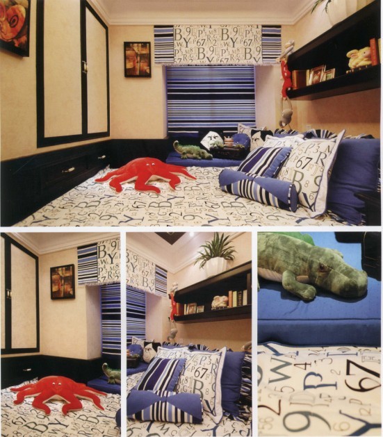 主臥用色極為大膽,以黑色作為背景的金花壁紙與宮延風(fēng)格羊毛塊毯運(yùn)用,令空間突顯了奢華富麗。兒童房的色彩對(duì)比極為強(qiáng)烈,各式卡通玩偶則令兒童房童趣盎然。