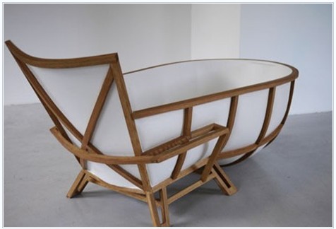 該浴缸尺寸為190厘米長(zhǎng)×85寬×84厘米高,木條把整個(gè)浴缸都包裹起來,整個(gè)造型有明顯的扶手和椅腿,就像是一把巨型的躺椅。