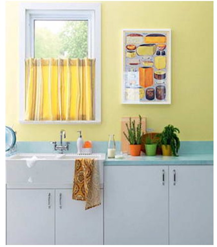 一談到廚房,就讓人聯(lián)想到油煙、閉塞、呆板之類的詞。想要讓不大的廚房輕松起來(lái)的話,試試選用淡黃色作為廚房墻面,搭配淺藍(lán)色的櫥柜臺(tái)面,瞬間廚房就明亮又從容起來(lái)。