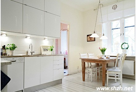 廚房設(shè)計(jì)的是開放式的,和用餐的餐廳是在一起的,餐桌和座椅搭配的很自然,周圍有些空間放上綠色植物,讓整個(gè)廚房空間顯得很有活力,并且白色的灶具及廚房用具都是以白色為主,整體顯示整潔、干凈。此種裝修設(shè)計(jì)讓整個(gè)戶型不同區(qū)域在地面上的變化很自然的營造出不同氛圍。