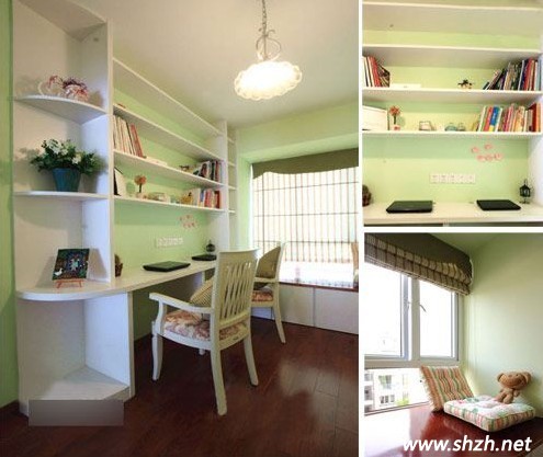 我們都知道書(shū)房是一個(gè)可以讓人靜下心來(lái)學(xué)習(xí)和工作的空間,因此,書(shū)房的裝修設(shè)計(jì)及色調(diào)的搭配都可以影響到人們的心境。上海裝潢網(wǎng)的設(shè)計(jì)師提醒我們家居裝修中書(shū)房裝修有很多的講究。例如其中一點(diǎn):書(shū)房要能夠讓人們靜下心來(lái)進(jìn)行閱讀、學(xué)習(xí)、工作。在這里小編就推薦給大家一款清新雅致的書(shū)房,此種書(shū)房的裝修設(shè)計(jì)營(yíng)造出一種輕松的氛圍,讓人們?cè)趯W(xué)習(xí)的過(guò)程中沒(méi)有壓迫感。同時(shí)也可以提高大家的工作效率哦!