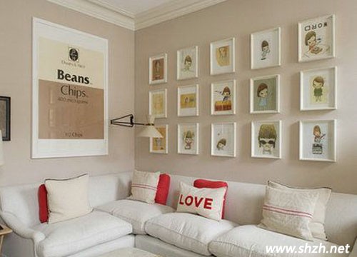 代替一整幅的壁畫,用多個小相架裝飾單調(diào)的墻壁,還能展示新婚夫婦的結(jié)婚照,讓客廳縈繞著甜蜜。紅白搭配的抱枕起到隔開大片白**塊的作用,讓房子達(dá)到冷暖平衡。