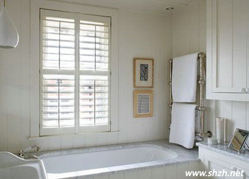 白色的木柵欄百葉窗,讓房子有多了一絲恬靜、一絲平和,搭配幾乎全白的設(shè)計(jì),浴室更加舒適。一點(diǎn)淡黃色的點(diǎn)綴,顯得純潔的白色更加明亮。