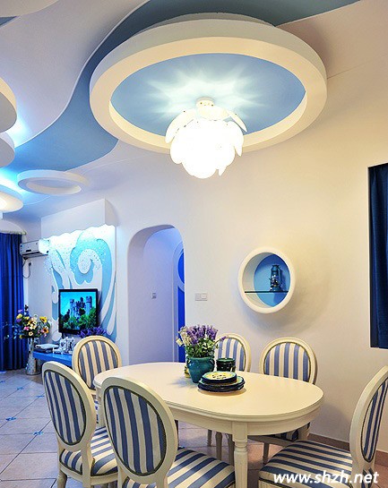 用白色和藍(lán)色為基調(diào)的搭配是比較典型的地中海顏色搭配。地中海的顏色特點(diǎn)就是,無須造作,本色呈現(xiàn),餐椅的藍(lán)色條紋像是海軍服一般的清新。地中海沿岸對于房屋或家具的線條不是直來直去的,顯得比較自然,因而無論是家具還是建筑,都形成一種獨(dú)特的**造型。如圖中的地中海式的吊頂,彎曲綿延而來,如蓮花般綻放開來,給生活注入浪漫。圓形拱門的設(shè)計(jì)大大符合的地中海的風(fēng)格,與蜿蜒的吊頂相互呼應(yīng),在走動觀賞中,出現(xiàn)延伸般的透視感