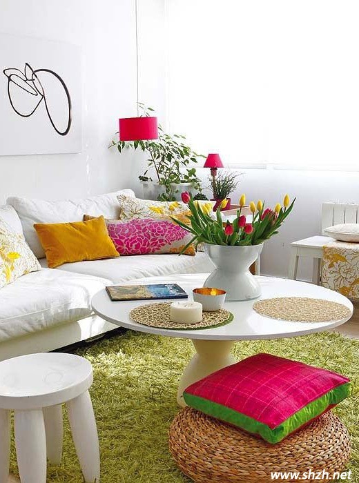 地毯的選擇,很可能也決定了這片區(qū)域的風(fēng)格走向,鮮艷的用色、地毯和家具的搭配也非常重要。創(chuàng)意的客廳空間充分顯示出與眾不同的風(fēng)格,對于略帶有鄉(xiāng)村風(fēng)格的客廳來說,這片草色的地毯是很好的選擇,純凈的茶幾和沙發(fā)下鋪有這樣一塊地毯,局部氣氛立刻強(qiáng)化出來。而草色地毯的質(zhì)感以及顏色的簡樸味道,與布藝沙發(fā)的格調(diào)非常融洽,能讓自然氛圍更加濃郁??繅|激活色彩,在現(xiàn)代的家居生活當(dāng)中,靠墊已經(jīng)不可缺少。它是色彩的精靈,是絕好的搭配用品,所以小清新也不能缺少了這些小精靈的點(diǎn)綴。溫馨的小清新風(fēng)格裝飾品,在清新的基礎(chǔ)上給人充足的溫馨感,別有一番風(fēng)味。茶幾上的小盆景,與角落里的綠色植物呼應(yīng),讓本來就生機(jī)勃勃的小小空間更加的迷人,還有什么可以阻擋我們對她們的喜愛。一本書,一杯咖啡,那種在咖啡吧才可以體會的浪漫,一樣可以搬回家!