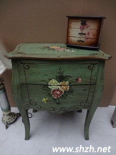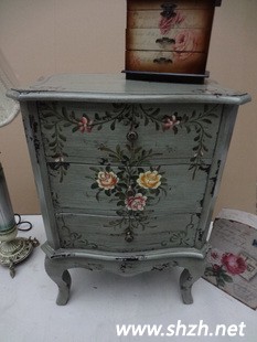 田園手繪風的法式鄉(xiāng)村家具,左側可做床頭柜、收納柜或者餐邊柜;右側同款可做餐邊柜 玄關柜 三斗柜。墨綠底色搭配古典花朵,讓你的春日多出一份曼妙的歐式情節(jié)。