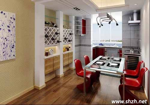 小戶型的餐廳,一般都是與客廳或者廚房連在一起,沒有相對獨立的空間。但是我們也可以通過一些裝飾來劃分出一個獨立的空間。在就餐的區(qū)域通過吊頂?shù)氖侄?,使就餐區(qū)的高度與客廳廚房有所不同,通過地面鋪設不同色彩的材料,在視覺上來加以區(qū)分。當然我們也可以通過隔斷在空間來分割出獨立的空間。