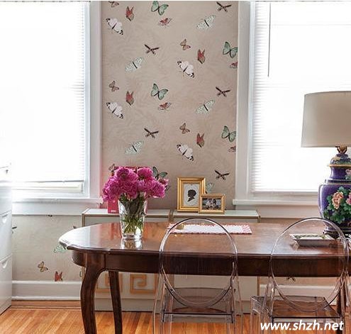 解析:圖一中帶有蝴蝶圖案的壁紙是這個居室的一大亮點,不似其他居室的單調(diào),著實增添了許多活力。桌臺上的鮮花跟蝴蝶壁紙搭配的和諧美觀。同時為了讓居室彰顯年輕時尚的氣息,透明椅子的加入是在是妙舉!