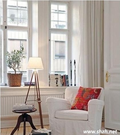 解析:不拘泥與傳統(tǒng)的書房設(shè)計,簡簡單單的這樣一張沙發(fā),一個小茶幾就滿足了我們的閱讀需求,白色的沙發(fā)與白色的墻壁門窗相互呼應(yīng),好不清新。