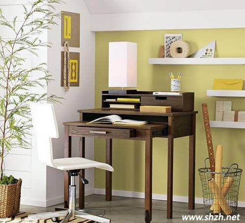 選擇一角放置幾塊簡(jiǎn)單實(shí)用的隔板,再選擇一款有木質(zhì)紋路的小書(shū)桌,用草綠色的墻紙,將這個(gè)角落改造成一個(gè)清新的小空間。我們所選的書(shū)桌雖然小小的,但它的神奇之處在于它可以伸縮自如,對(duì)于小戶型的空間來(lái)說(shuō)真是一件寶貝;帶抽屜的小書(shū)桌閑暇之余還能存放手機(jī)、MP3等等日常的用品。另外這款書(shū)桌還可以搭配擴(kuò)容架,讓功能更強(qiáng)大。