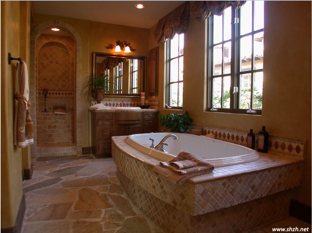 拱形門的裝飾,一下子把西班牙傳統(tǒng)的設(shè)計(jì)風(fēng)格帶了進(jìn)來(lái)。大量采用了馬賽克的元素,,馬賽克是西班牙風(fēng)與地中海風(fēng)裝修的寵兒。這個(gè)衛(wèi)生間空間并不算很大,但透過(guò)玻璃窗自然的光線一樣能夠覆蓋這個(gè)空間。