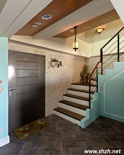 進入就已經(jīng)察覺了這個家庭設(shè)計的特點,淺藍色的使用讓室內(nèi)環(huán)境一下子年輕了起來,同時為了讓老人家在室內(nèi)生活的也比較舒適,天花板,墻面地面則使用了不太顯眼的淳樸色彩,看上去時尚卻不輕浮。