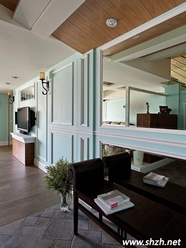 玄關(guān)處,古典的換鞋座椅是貼心的小細節(jié),家中的老人也可以從小小的細節(jié)中看見家人對于自己的關(guān)心而內(nèi)心溫暖,華麗的線條與其上面鏡框樣式的穿衣鏡想呼應(yīng),美式風(fēng)格躍然而出,原木色的地板看上次大氣穩(wěn)重。