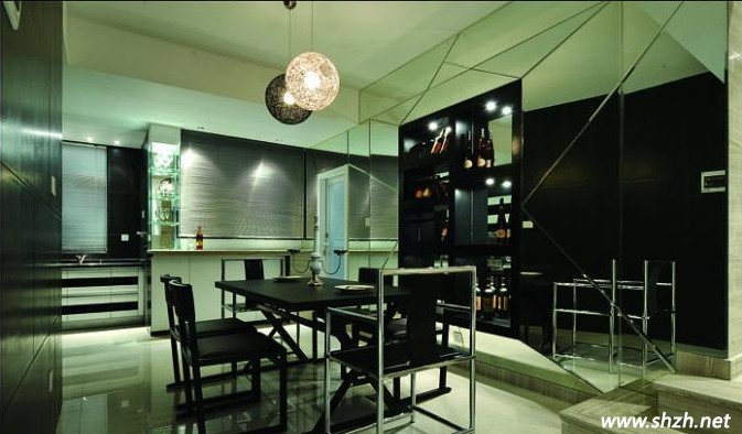 餐廳銀鏡勾勒出幾何形體的鉆石面,把黑色皮紋磚的細膩、不銹鋼的精美與雅致襯托得淋漓盡致,高檔且時尚。開敞的流動空間中,所蘊含的是空間的品質(zhì),摒棄多余的裝飾,保留材質(zhì)本身的美感與形體的純粹,使空間呈現(xiàn)出多元的藝術(shù)元素與生活情趣。一個空間的設(shè)計,表達了一種情愫,也是一種生活方式的體現(xiàn),這不僅把整體的立體感發(fā)揮出來,從中也透露出了很多的文化內(nèi)涵。