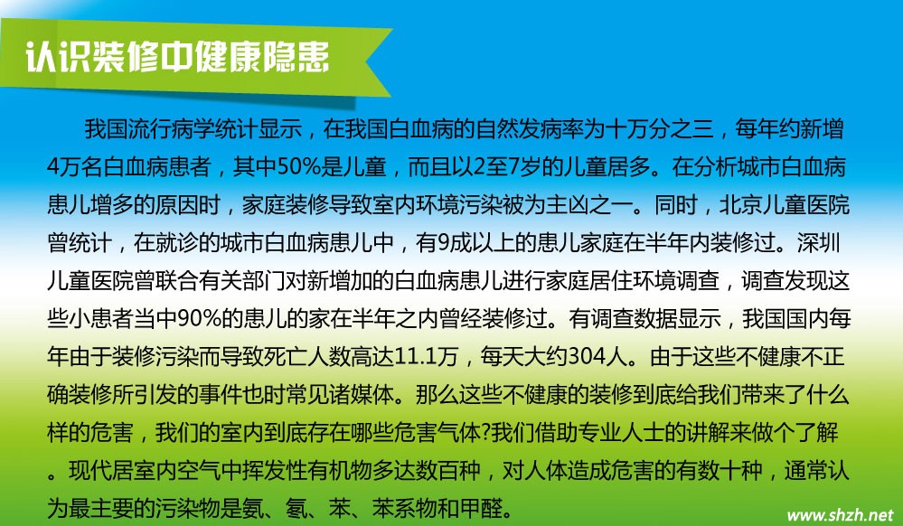 資料顯示,1/3的白血病患者發(fā)病與家庭裝修有密切關系。這是因為裝修中天然石材射線會損害人體造血功能,油漆、涂料、黏合劑等含有的化合物(尤其是苯類),被人體吸收后可使DNA斷裂和移位,導致細胞癌變。醫(yī)學研究證實,長期接觸苯、甲醛類物質(zhì)人群患血液病概率要高于普通人群。