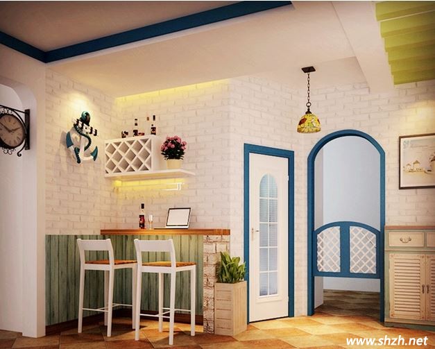 二:貼墻式吧臺。上海裝潢網(wǎng)小編認為,如果你家是小戶型的房屋,除了餐桌式的多功能吧臺,這種貼墻式的吧臺也是不錯的選擇。設計要點:把你喜歡的吧臺就緊貼著一段較小的墻面擺放,非常節(jié)省空間的設計,另外要是想追求一下藝術(shù)效果的話,那么你可以在吧臺的上面就是頂棚嵌入漂亮的筒燈,不同顏色的光束打在你家精致的酒具上,整個效果會非常的時尚。
