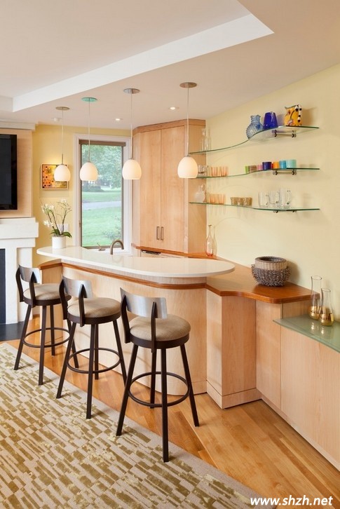 四:轉(zhuǎn)角式吧臺。設計要點:苦于沒有多余的地方來安放吧臺的話,你家的房間轉(zhuǎn)角部位也是個不錯的選擇,只要你安排的合理,不僅可以讓你的居室看起來整齊緊湊,而且有客人來訪的時候圍著吧臺而坐,非常方便。