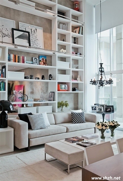 你家的客廳墻面是選擇組合式還是架子式由你決定。無論是哪一種都要記住“留白”的魅力,墻面豐滿而不擁擠才是完美的搭配。小小的留白會讓你和來訪客人思緒飛揚(yáng),其帶來的藝術(shù)效果不言而喻。