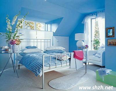 家具:房間家具的選擇,最有創(chuàng)意的要數(shù)在床上用品的選擇,選用藍(lán)色格子的被子,正好與整個(gè)房間的顏色呼應(yīng)。