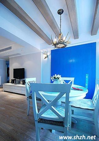 地面:地面和沙發(fā)都選用白色的,很好的緩沖了藍(lán)色所帶來(lái)的大面積的沖突感,整個(gè)空間看起來(lái)更加的協(xié)調(diào)。