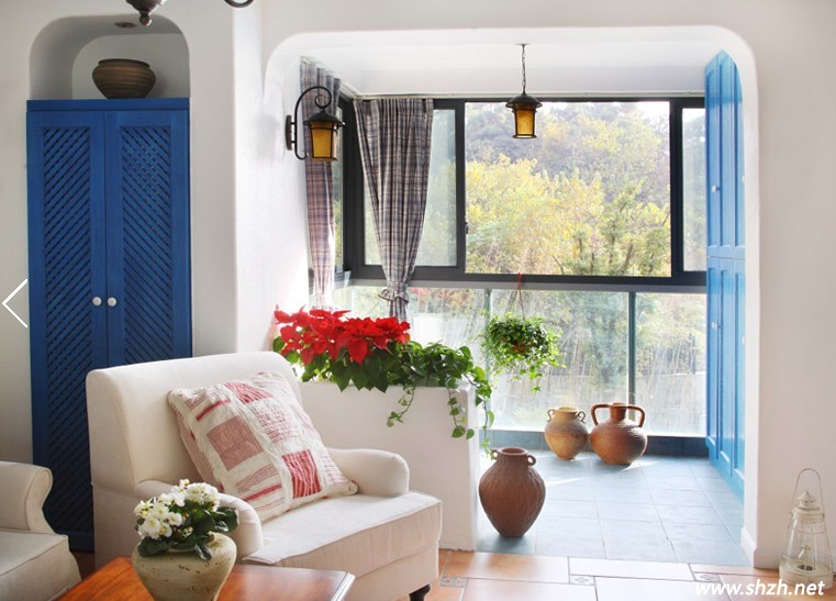 角落里的風(fēng)采。嵌入式的深藍(lán)色柜子,帶著濃濃的海洋風(fēng)味,而地面上的各種藝術(shù)裝飾瓶,個(gè)性張揚(yáng)可愛(ài),各種鮮花綠植,更是增添了幾分自然清新的氣息。白色的單人沙發(fā),清新雅致。藍(lán)色調(diào)的柜門,更是唯美浪漫。藍(lán)白色調(diào)的完美結(jié)合,造就了浪漫的地中海風(fēng)范。