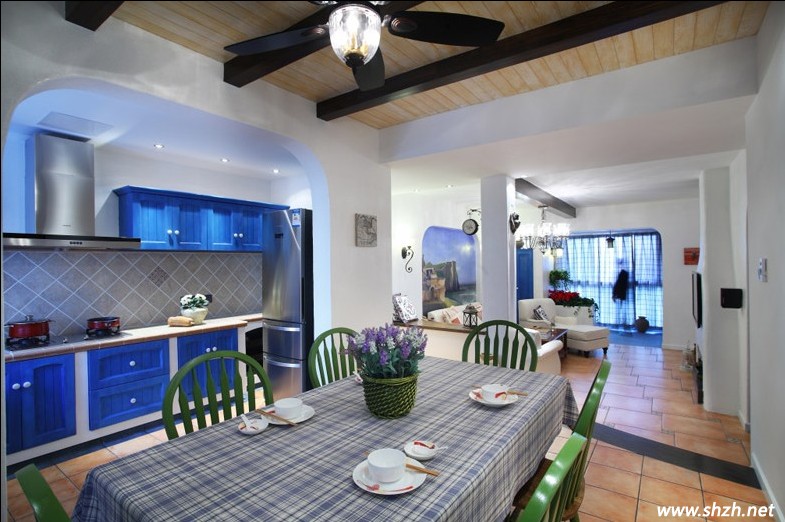 當(dāng)真正的進(jìn)入餐廳,真是讓我眼前一亮。透過(guò)拱形門就是廚房的區(qū)域了,藍(lán)色調(diào)的櫥柜門是那樣的夢(mèng)幻。而餐桌上的紫色薰衣草,當(dāng)法式風(fēng)味飄進(jìn)地中海居室內(nèi),是不是更加的浪漫唯美呢?