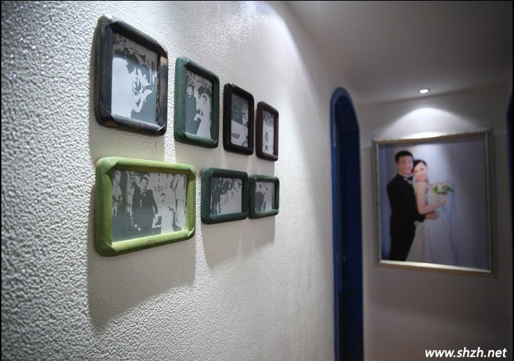 從這里進(jìn)去就是婚房了,凹凸不平的白色墻壁,紋理清晰可見(jiàn),古典的相框裝飾墻壁,純白的墻面不再變得單調(diào)乏味。而婚紗照的擺放,讓我們感受到了愛(ài)情的美麗。