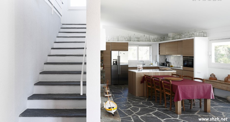 這里就是一樓了,整個(gè)空間全部打通,非常寬敞明亮,擴(kuò)大了視覺空間。而且白色本身就能給居室?guī)砻髁恋母杏X,大大的落地窗戶,從室內(nèi)可以直接欣賞到室外的美景,非常的愜意。而就餐的區(qū)域,實(shí)木的桌椅打造,很有異國的情調(diào),相信在這樣的一個(gè)環(huán)境下進(jìn)餐,一定會(huì)非常美妙舒適的。角落里用竹子編織的籃子,雖然不顯眼,卻格外的有情調(diào)。而就地取材的石頭材質(zhì)拼湊成地面,與戶外環(huán)境好不費(fèi)力的融合在一起,更加的貼近自然。