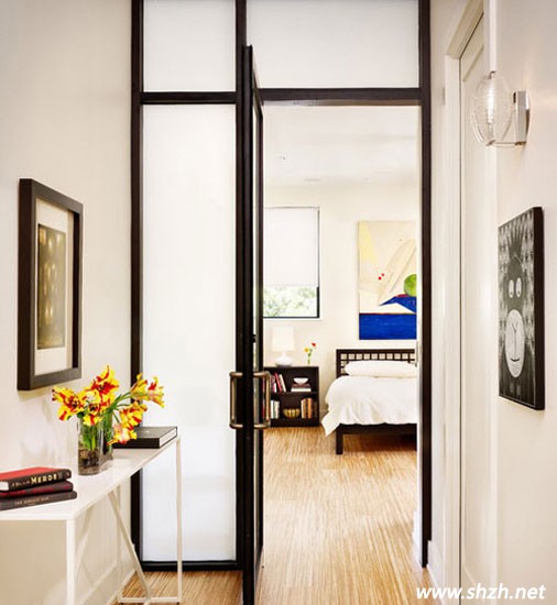 臥室可是最隱私的區(qū)域,當然不希望暴露在視線內。這款玄關區(qū)域,正對的是十分少見的臥室空間,因此,臥室區(qū)域自然要有東西進行隔斷保護,而帶有門的毛玻璃隔斷,有效的將2個區(qū)域分開,同時也起到了雙層防護的作用,是不是很有創(chuàng)意呢?